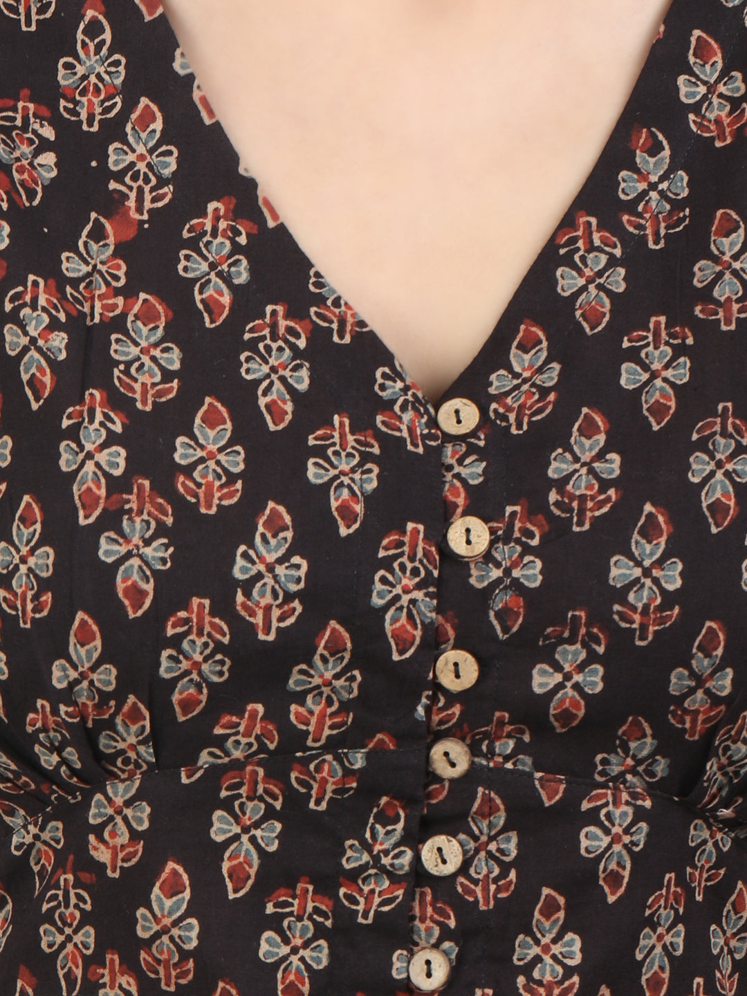 With a graceful V-neck, short sleeves, and exquisite Ajrakh block prints, this blouse captures the essence of cultural elegance. The button closure adds a practical yet stylish touch, making it an ideal choice for any occasion.
