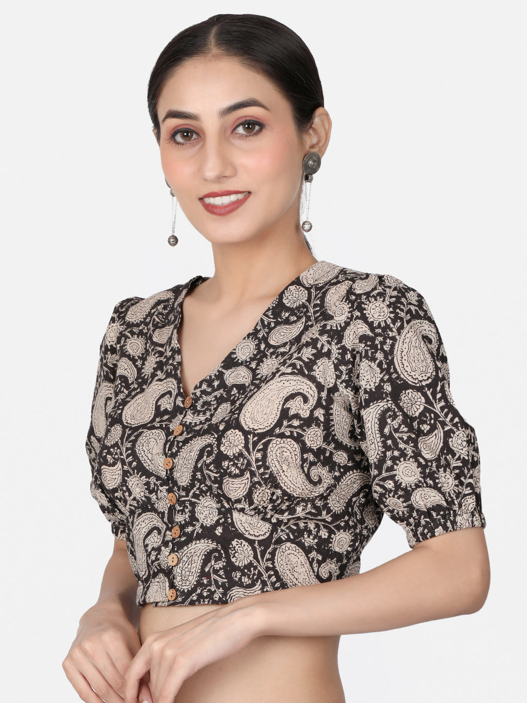 Black and beige printed blouse has a V-neck, short puff sleeves, and button closure detail.