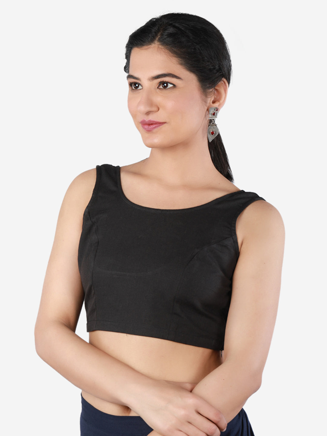 Black solid non padded saree blouse has round neck, sleeveless and side zip closure