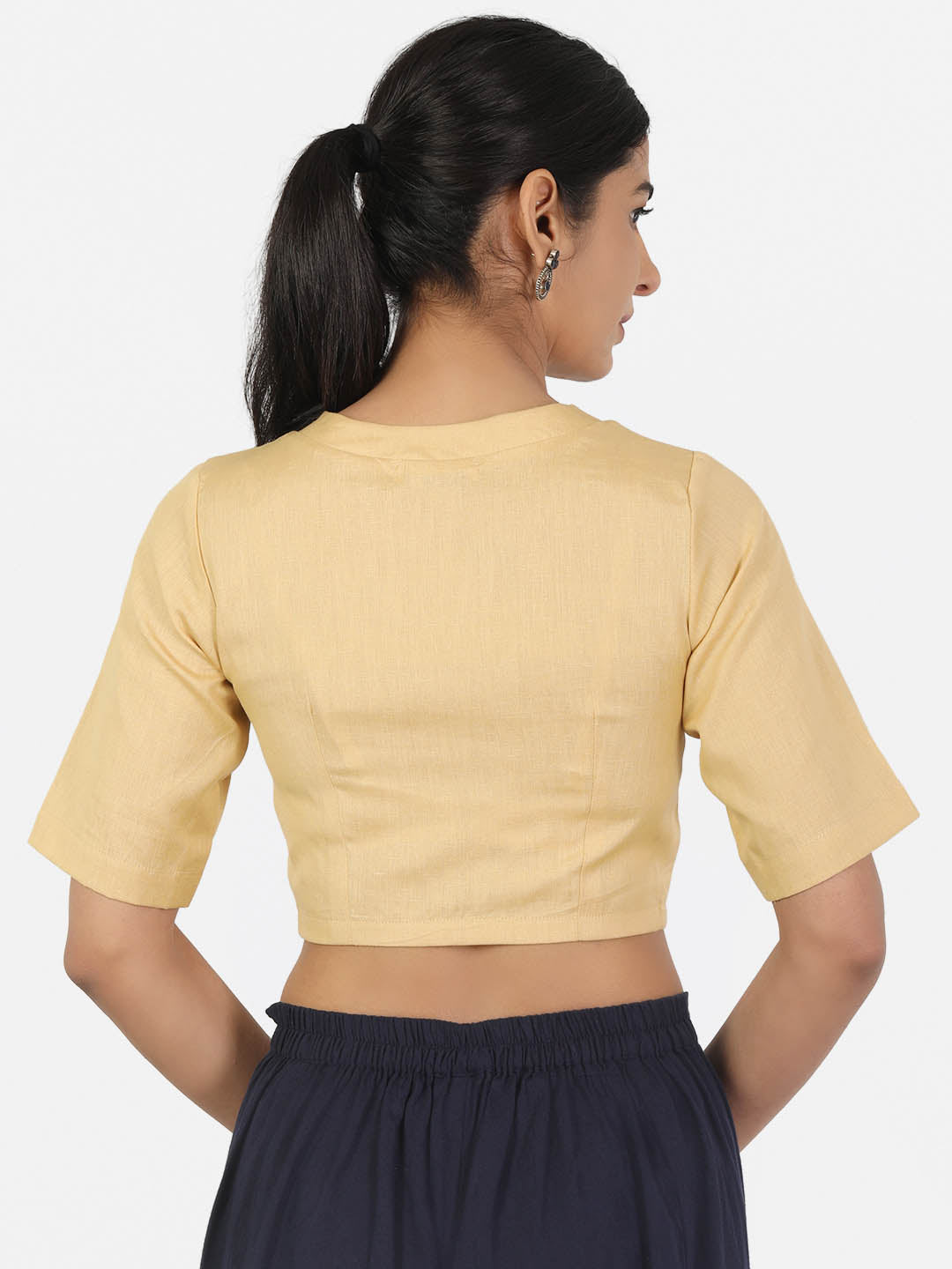Beige Cotton Non Padded Saree Blouse has Mandrin collar, Elbow sleeves and front wooden Button Closure