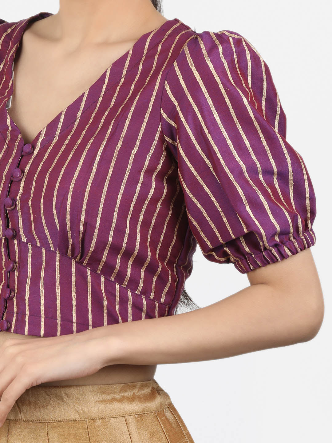 Women Purple Block Printed Art Silk Non Padded Saree Blouse has V Neck Front Button Closure with Short Sleeves