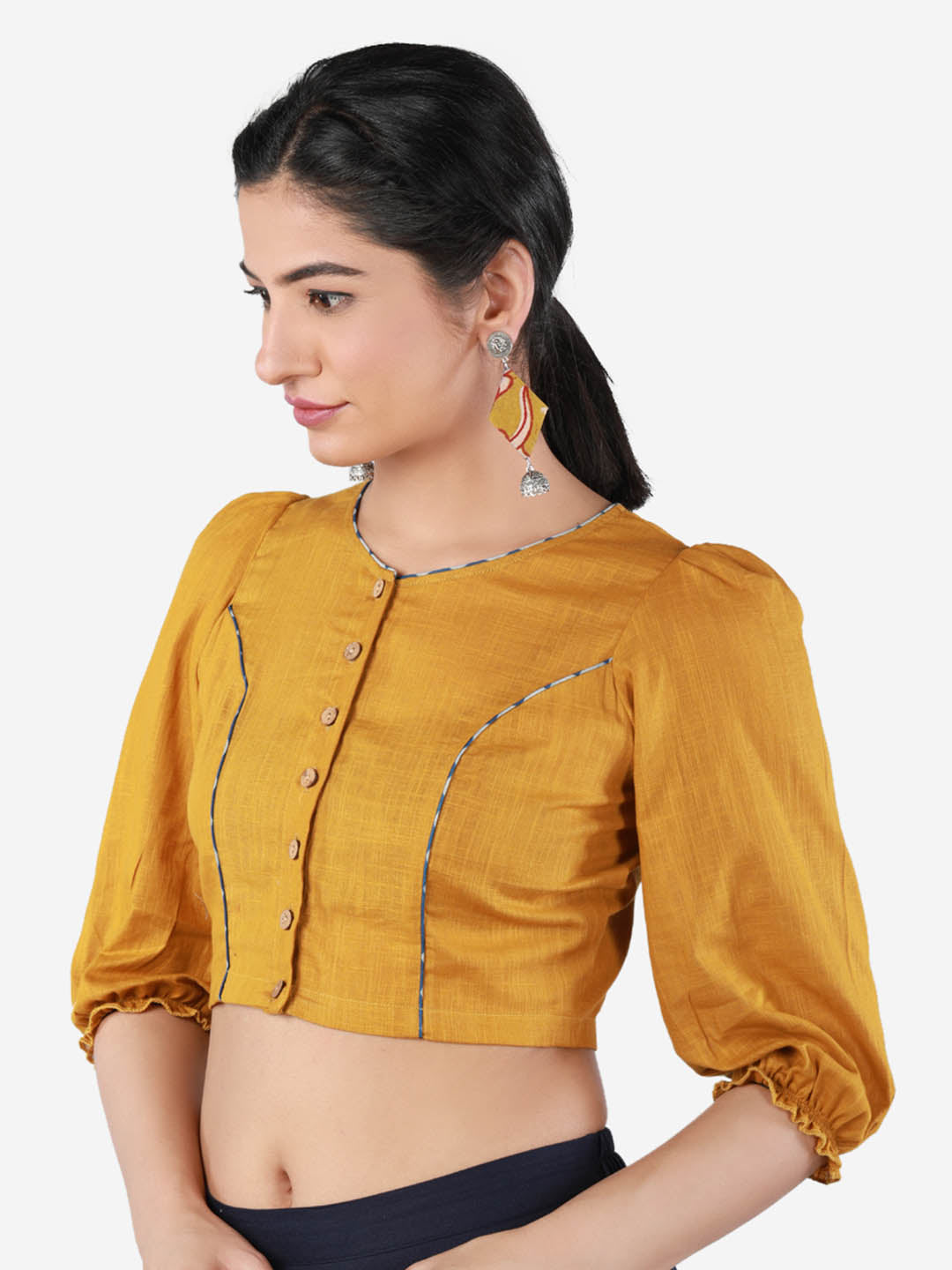 Solid Mustard Yellow, Front button Closure, Printed piping, 3/4 sleeves, Non padded Saree  Blouse